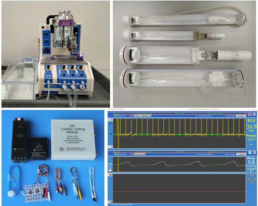 Hayvan fizyolojik vital sinyalleri SA Instruments Model 1030 MR uyumlu deney hayvanı monitörizasyon ve sinyal tetikleme sistemi ile takip edilmektedir: EKG, kalıp atm hızı, solunum hızı, vücut sıcaklığı izlenmekte, EKG ve solunum tetikleme ile görüntüleme yapılabilmektedir.